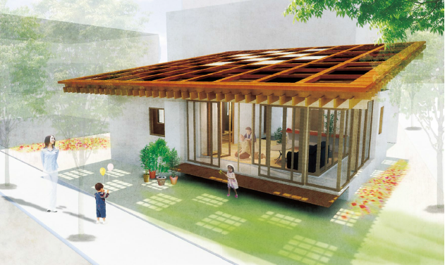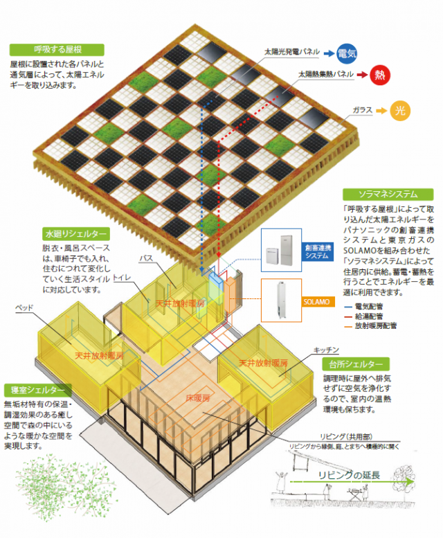 芝浦工大のテーマは「母の家2030ー呼吸する屋根・環境シェルターによるシェア型居住スタイル」。学生の母親世代が高齢となる2030年の住環境を考え、パネルと通気層で太陽エネルギーを最大限に活用する「呼吸する屋根」、寝室や水まわりなどの生活に必要な機能をユニット化した「環境シェルター」などを備える。