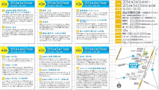 一般社団法人エコハウス研究会は、「エコハウスマイスター」養成講座を3月16日から5月25日まで東京・自由学園明日館(東京都豊島区)にて全6回シリーズで開催する。