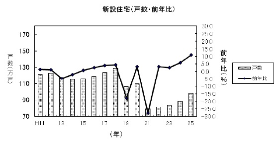 国土交通省が1月31日発表した2013年の住宅着工戸数は、総戸数が前年比で11.0%増の98万25戸となり、4年連続の増加となった。