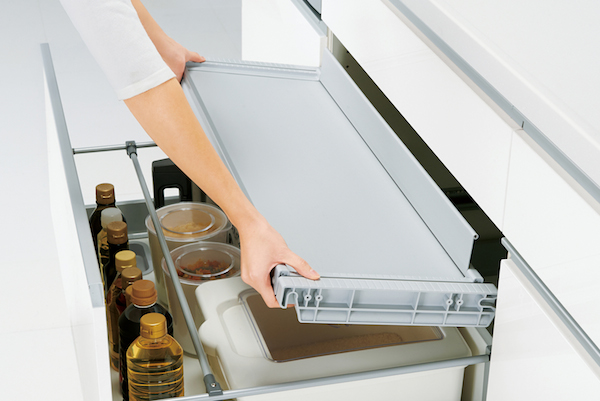 間口255センチの場合、収納容積は最大約550L(同社従来比115%)、平置き面積約3.09平米(同145%)、総耐荷重約218キロ(同185%)と収納力を大幅に向上。もっともよく使うベースキャビネットに、日常づかいの鍋・フライパン、調味料、調理小物、カトラリーをすべて収納できるだけでなく、カセットコンロやホットプレート、缶詰といったアイテムも十分にしまえる。