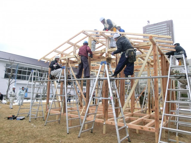 当日は午前に座学として活動の意義や施工の概要について説明を受けたのち、午後は実際に木造応急仮設住宅の構造躯体を組み立てた。9坪タイプ躯体を約30人が交代で施工し、木杭打ちから土台敷き・柱立て・小屋上棟まで2時間で完了した。