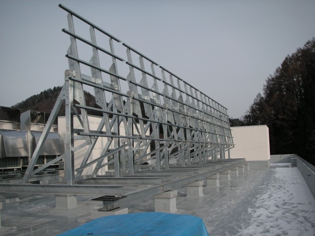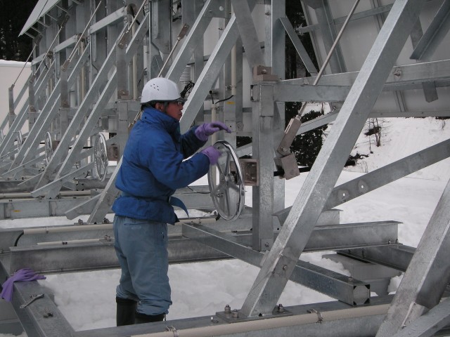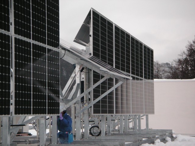 同社の製品を用いれば、重量のあるパネルをハンドルにより手動で簡単に角度調整できる。すでに湯沢市役所に同社によって昨年12月に設置されている。