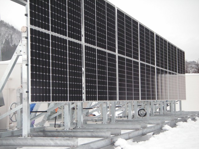 2012年1年間で測定した、同じ雪国である北海道江別市における実証データによると、同地では傾き33度で設置した一般的な太陽電池パネルより、直立させた90度のものの方が約2倍発電効率が高かったという。これは直立によって着雪がないことと同時に、雪の積もった地面からの反射光も利用できるためだという。