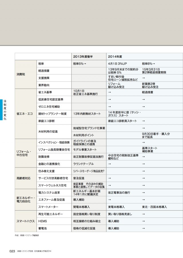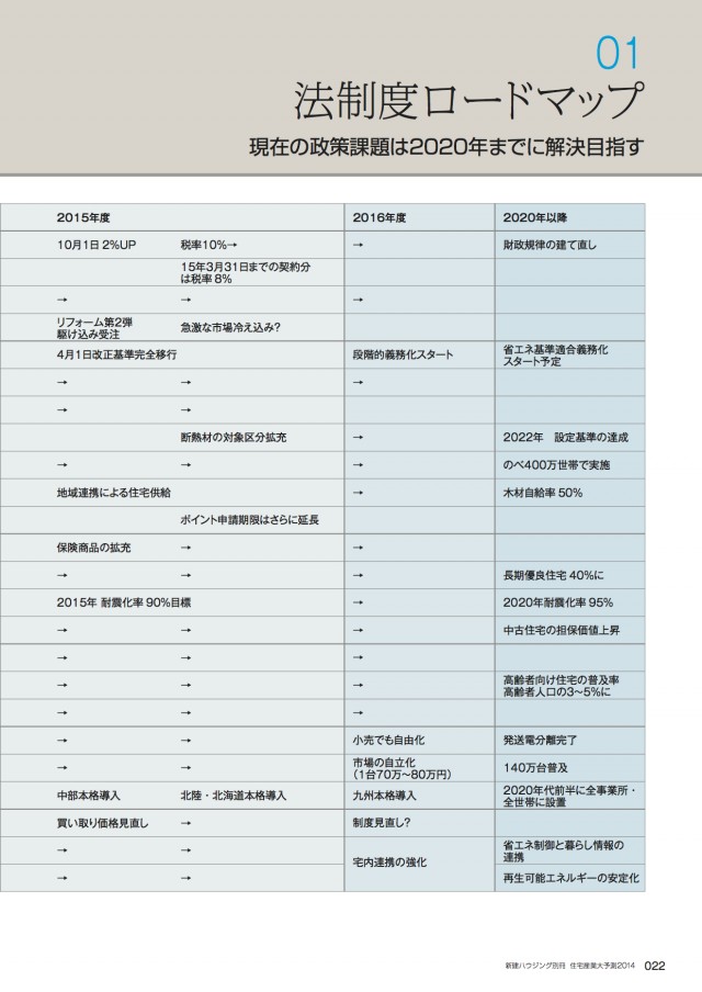 新建ハウジングでは2013年〜2015年の法制度ロードマップを作成、「住宅産業大予測2014」に掲載しました。