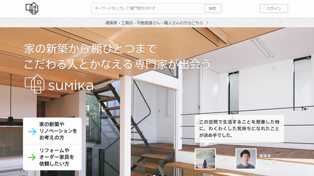 SuMiKa(東京都港区)は3月3日、住宅の新築・改築・リノベーション時に、生活者が自分の暮らしをイメージしやすくすることで、事業者との効率的なマッチングを行うウェブサービス「SuMiKa(スミカ)」をオープンした。