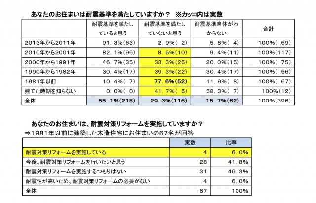 1981年以前に建てた木造住宅に住む67人に耐震診断を受けたか聞くと、「受けたことがある」は4.5%。耐震対策リフォームを実施したかどうかについては「実施している」は6.0%にとどまった。