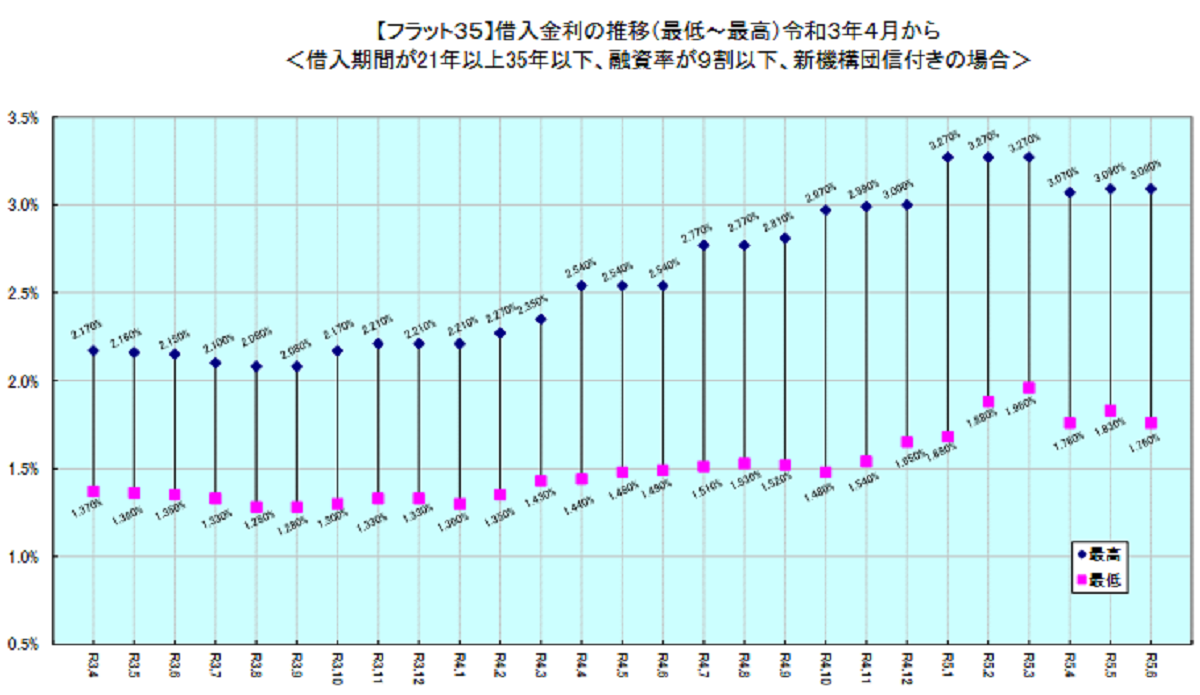 住宅金融支援機構(東京都文京区)が民間金融機関と提供するフラット35の金利が過去最低水準となった。同機構が3月4日に発表した、各民間金融機関が提供する3月の金利は、主力である返済期間21年以上35年以下の融資率9割以下タイプの最低金利が1.74%となり、これまでの最低金利だった前月の1.79%から一気に0.05%下がった。返済期間20年以下の融資率9割以下タイプの最低金利も1.48%と、これまでの最低金利だった2013年4月の1.49%より0.01%低かった。