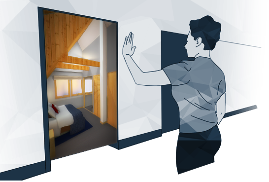 コントローラを使わずに操作できる体感型ゲームシステム「Kinect(キネクト)」を活用することで、3Dで再現した空間を歩いたり、照明や家具の配置、種類を自由に変更できるシステム。