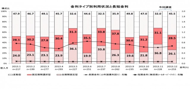 それによると「変動型」の利用割合は11月が32%だったのに対し12月は45.5%と2013年4月頃の水準まで増加。一方、「固定期間選択型」「全期間固定型」ともに、12月は11月よりも減少した。