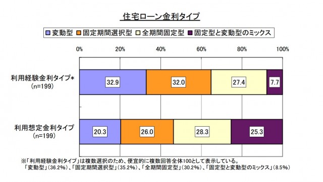住宅ローン利用時の金利タイプを聞くと、利用経験があるものでは「変動型」「固定期間選択型」「全期間固定型」が3割前後だったのに対し、希望の金利タイプでは「固定型と変動型のミックス」の割合が大幅に増えた。