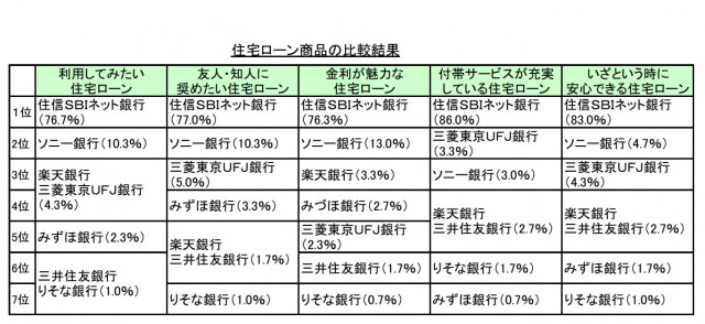 また、社名を伏せて7社の住宅ローン商品を比較してもらったところ、利用してみたい住宅ローン、友人・知人に薦めたい住宅ローン、金利が魅力的な住宅ローンなど全5項目で「住信SBIネット銀行」が1位になった。