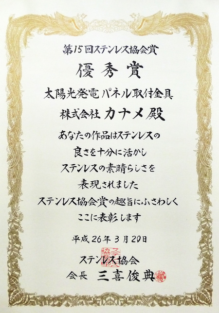 カナメ(栃木県宇都宮市)の産業用太陽電池用の「取り付け金具」がこのほど、ステンレス協会(東京都中央区)がすぐれたステンレス製品を表彰する「第15回ステンレス協会賞」の優秀賞を受賞した。