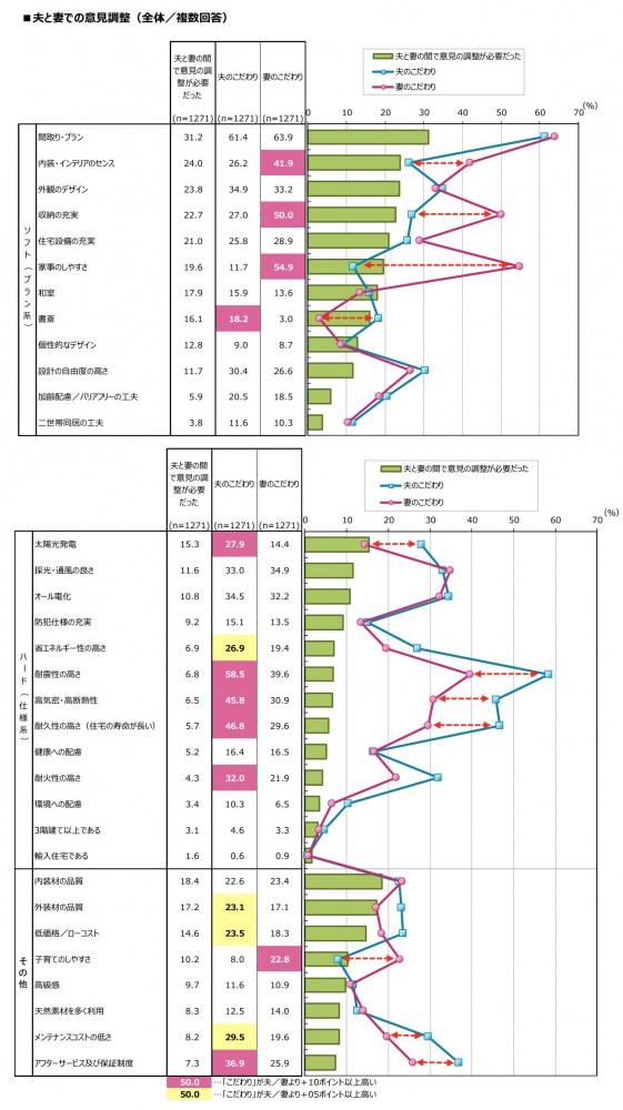 こだわったポイントでは、夫・妻ともにトップは「間取り・プラン」(夫61.4%、妻63.9%)。夫は「耐震性の高さ」(58.5%)、「耐久性の高さ」(46.8%)などのハード面、妻は「家事のしやすさ」(54.9%)、「収納の充実」(50%)などソフト面へのこだわりがつよかった。また、二世帯住宅に限ってみると「和室」へのこだわりは夫婦ともに1割強だったのに対し、親は23.3%と高めで、16.7%が意見調整が必要だったとした。
