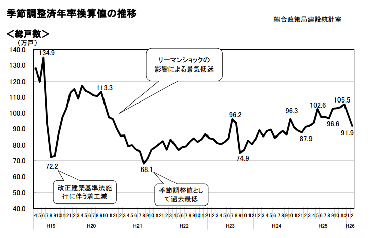 持家・分譲住宅の減少には消費税増税後の反動減の影響がみられ、とくに分譲マンションの大幅減には資材・手間の高騰による受注契約難航も減少の要因になっているとみられる。