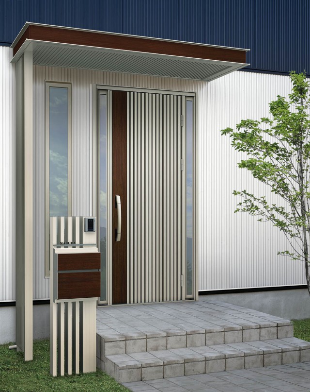 化粧パネル24パターン、ひさし20パターンを用意し、住宅外観や玄関ドアに合わせたコーディネートが可能。またデザインによる価格差をなくしたことで、選択肢が広がった。出隅・入隅どちらの納まりに対応する。