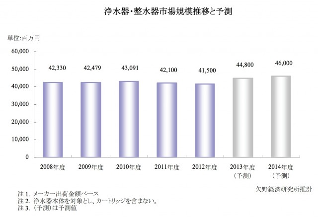 矢野経済研究所(東京都中野区)はこのほど、浄水器・整水器市場に関するヒアリング調査を行い「2014年版 浄水器・整水器市場の実態と展望」にまとめた。調査期間は2013年12月~14年2月。