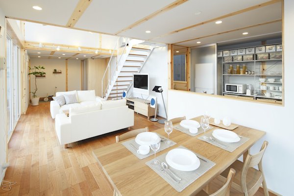 モデルハウスは間口7間x奥行4間の「木の家」で、壁の少ない大空間により自由にインフィルを変えられるのが特徴。ターゲットである一次取得者層、3人暮らしの住まいを想定した空間となっている。 延べ床面積は32.82坪、本体工事価格は税込2230万円。