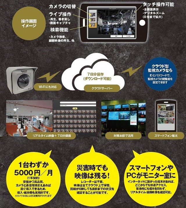 TDモバイル担当者は「レコーダー型のネットワークカメラの多くは、現地にレコーダーを設置するが、これでは災害時に同時被災する可能性がある。クラウド型は仮に現地が被災してもデータはクラウド上で管理されているため映像が残る」とシステムの優位性を語る。レコーダーが不要のためイニシャルコストが大幅に下げられるメリットもある。