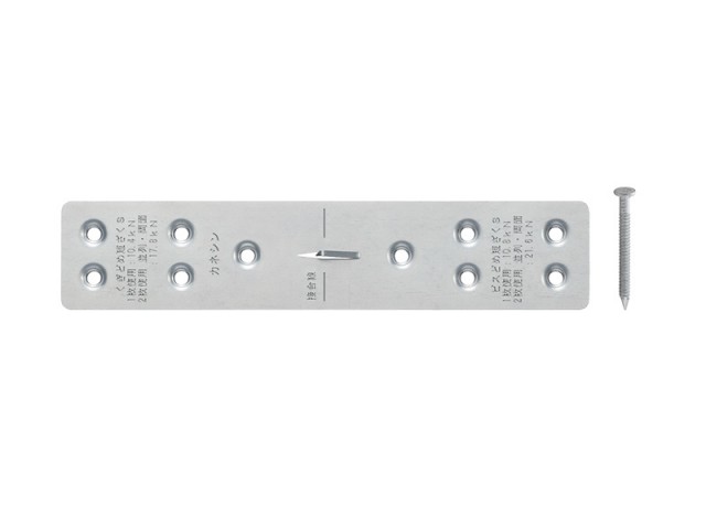 短期基準接合引っ張り耐力は1枚(片面)で10.4kN、2枚(並列・両面)で17.8kN。0.6ミリ厚と薄いため、構造用合板や下地材にそのまま張ることができる。 金物中央部のツメにより位置決めが容易で、クギ留めのため施工も容易。215円/枚。