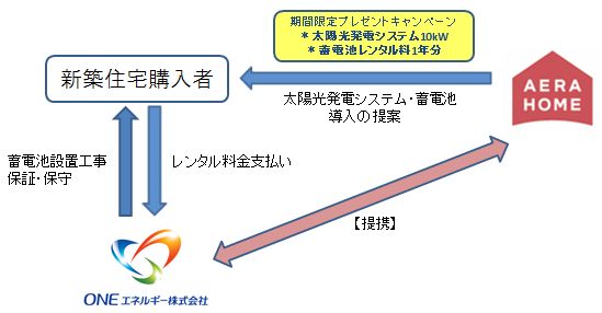アエラホーム(東京都新宿区)とONEエネルギー(東京都港区)は、家庭用蓄電システムのレンタルサービスで業務提携した。アエラホームの新築住宅購入者に、蓄電システムをレンタルで提供する。電気を貯めて上手に使う暮らしを初期導入コストを抑えながら、提案していく。