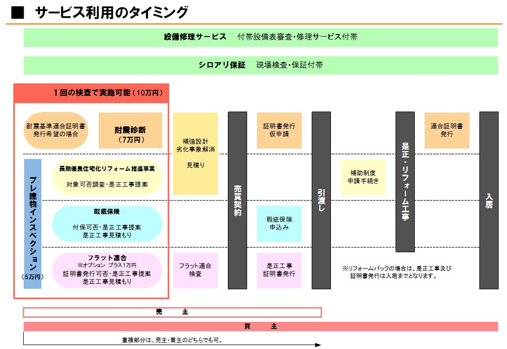 既存住宅流通サポートサービスは、設備やシロアリを対象としたサービスのほか、「建物インスペクション」「耐震診断及び耐震基準適合証明書発行」「瑕疵保険検査及び保険付保」「フラット35適合検査及び適合証明書発行」「長期優良住宅化リフォーム推進事業関連調査」に必要な現地調査などをワンストップで提供するもの。