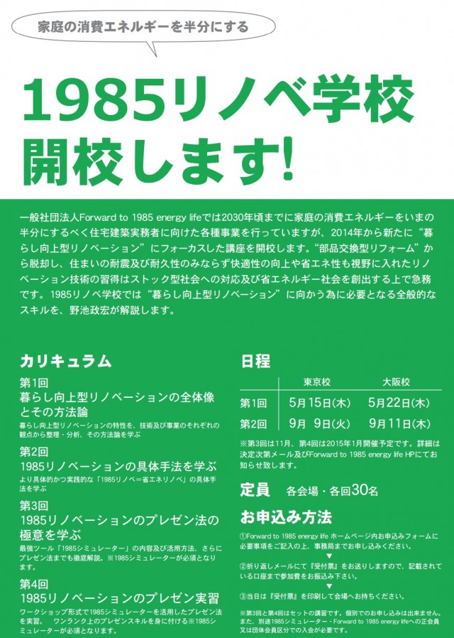 一般社団法人Forward to 1985 energy life(大阪府池田市、野池政宏代表理事)は5月、東京・大阪において新たに“暮らし向上型リノベーション”に特化した講座「1985リノベ学校」を開校する。
