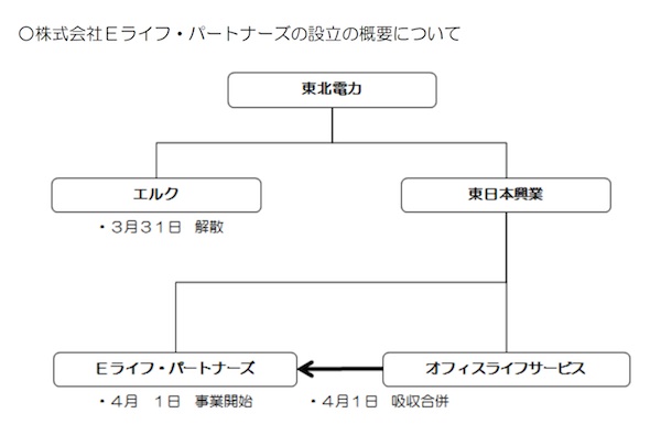 東北電力グループは新会社として株式会社Eライフ・パートナーズ(宮城県仙台市、伊藤洋二社長)を2014年2月13日に設立、4月1日から事業活動を開始した。また、同日付けで家庭用電気器具販売のオフィスライフサービス(宮城県仙台市)を吸収合併した。