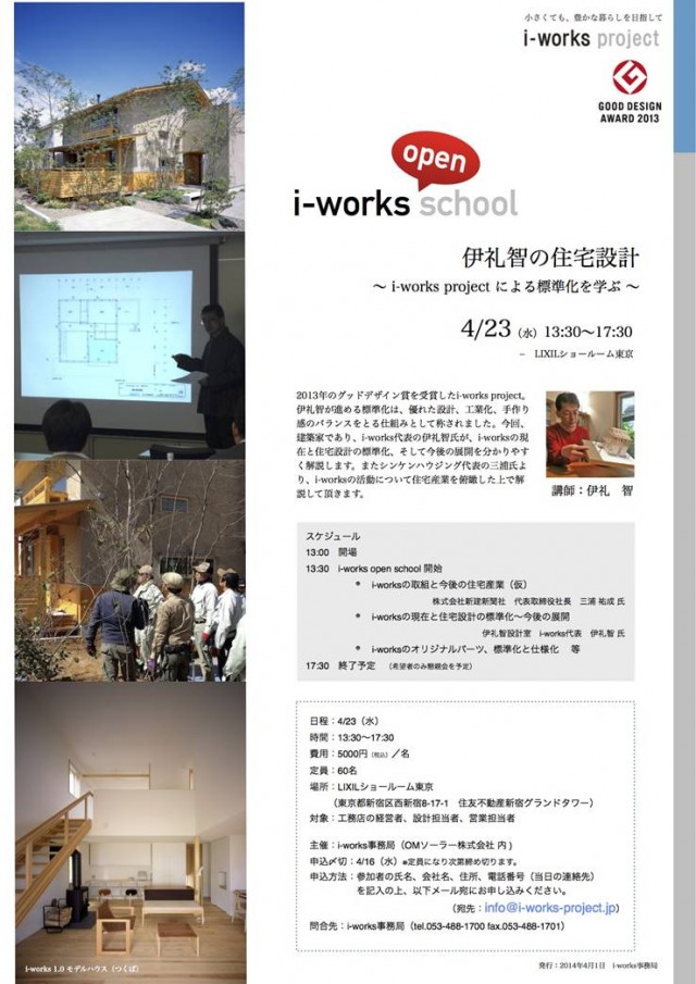 建築家・伊礼智氏を中心に家づくりの標準化を進めるi-works project(運営:OMソーラー、静岡県浜松市)は4月23日、東京・西新宿において工務店の経営者や設計者向けにオープンスクール「伊礼智の住宅設計〜i-works projectによる標準化を学ぶ〜」を開催する。