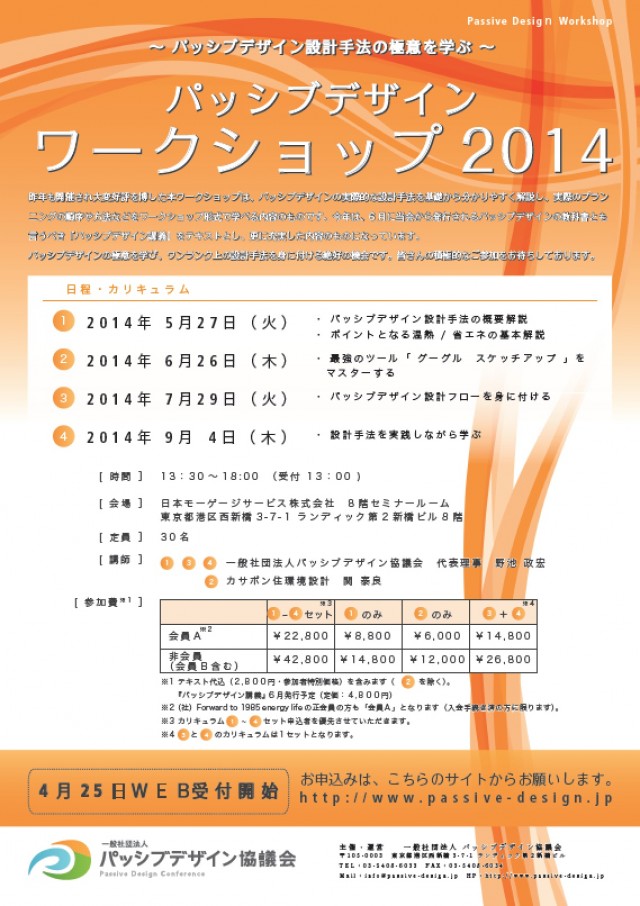 一般社団法人 パッシブデザイン協議会(事務局:東京都港区、野池政宏代表理事)は5月から9月まで、パッシブデザイン設計の基礎から実際のプランニングまでを全4回の講座で身につけることをめざす「パッシブデザインワークショップ2014」を開催する。