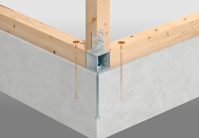 基礎と柱の緊結や、ホールダウン金物の代わりに使用するもの。無等級のスギ無垢材(含水率15%以下)で使用することができ、高耐力の引き抜きに対応。施工性を向上する偏芯座金を採用している。6000〜6300円/個。