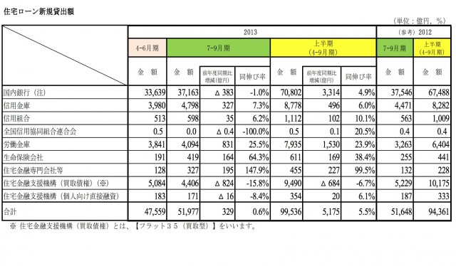 それによると、2013年度7ー9月期の住宅ローン新規貸出額は5兆1977億円と対前年度比で0.6%増加。2013年度上半期の住宅ローンの新規貸出額は9兆9536億円、対前年度比で5.5%の増加となった。詳細はコチラからダウンロードできる。
