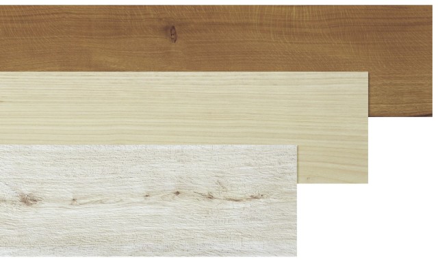 ひとつは、本物の木のような心地よい感触が味わえるシート床材「アーキスペックYUKA木肌触感タイプ」。樹種はブナ、キリ、ナラの3種で、3人の工芸作家の協力を得て天然木の表情と触感をシートで再現した。傷・汚れに強く、手入れがしやすい。4万3000円/坪。