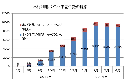 木材利用ポイント事務局の発表によると、4月の木材利用ポイント申請件数は木造住宅の新築やリフォームによるものが8895件、薪ストーブや木製品の購入によるものが740件だった。いずれも3月に比べ減った。累計では5万5548件になった。
