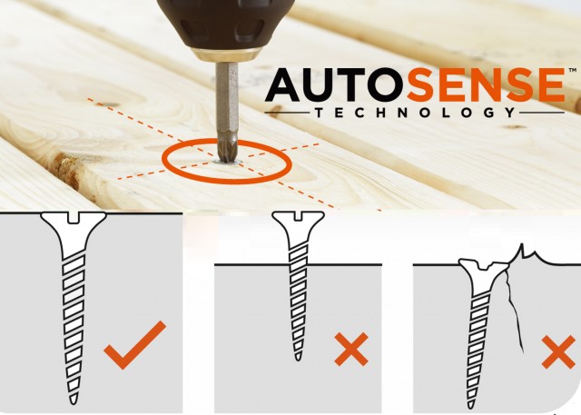 新たに搭載する「オートセンス」機能は、ネジ締め時の負荷をセンサーが感知し、ネジ頭が板面にぴったり収まる位置で自動的に回転を止めるため、従来のトルク調整機能よりも、正確かつ簡単なネジ打ちが可能になるという。同時に、ネジ頭が打ち込む板面の上面と水平になる、きれいな仕上がりも実現する。回転が一旦停止した後、スイッチを入れ続けると4分の1回転ずつ締めることができるため、微調整も容易。