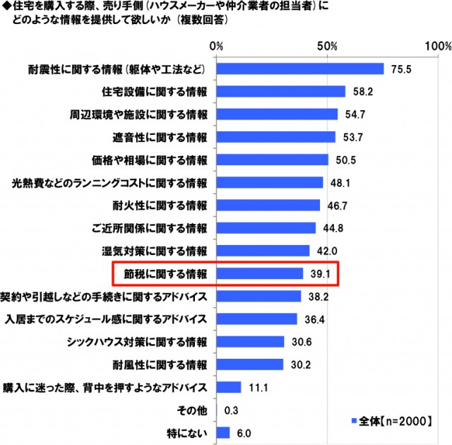 また、住宅を購入する際に売り手側にどのような情報を提供してほしいかについては、「耐震性に関する情報(躯体や工法など)」(75.5%)が最多で、「住宅設備に関する情報」(58.2%)、「周辺環境や施設に関する情報」(54.7%)が続いた。