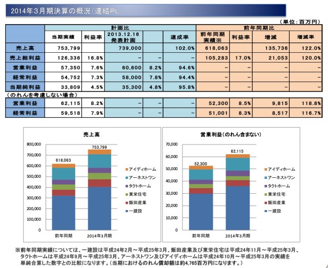 飯田グループホールディングス(東京都西東京市)はこのほど、2014年3月期の業績を公表した。昨年11月に一建設、飯田産業、東栄住宅、タクトホーム、アーネストワン、アイディホームの6社の経営統合後、初の通期決算発表。