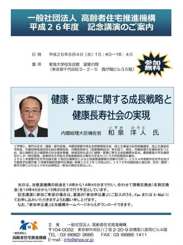 高齢者住宅推進機構(東京都中央区)は6月4日、高齢者の暮らしや高齢者住宅のあり方、福祉との連携強化について関係事業者に向けて最新情報を提供する「平成26年度 記念講演」を開催する。
