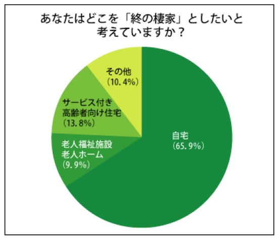 どこを終の棲家にしたいと考えているかについては、「自宅」(65.9%)がダントツで、「サービス付き高齢者向け住宅」(13.8%)、「老人福祉施設・老人ホーム」(9.9%)が続いた。
