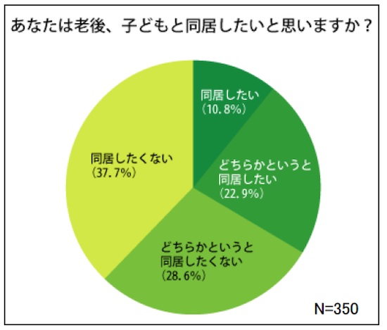 子どもがいる350人に老後は子どもと同居したいか聞くと、「同居したくない」(「どちらかというとしたくない」含む)が66.3%で、「同居したい」(「どちらかというと同居したい」含む)の33.7%を大きく上回った。