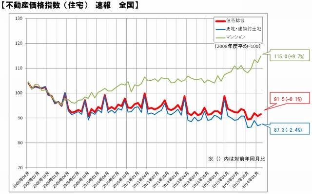 国土交通省が5月28日発表した、2月分の不動産価格指数(住宅)の速報値は、マンション指数(全国)が115.0で、記録がある2008年4月以降の最高値を更した。前年同月比では9.7%の上昇で、14カ月連続でのプラス。住宅総合(全国)は91.5(前年同月比は-0.1%)だったが、1月分(-2.2%)と比べて、下落幅は縮小した。