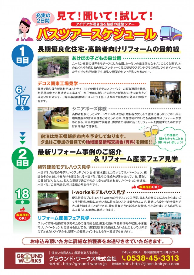 グラウンド・ワークス(静岡県袋井市)は、「最新リフォーム・リノベーション実例見学&体験バスツアー」を開催する。日程は6月17日(火)、18日(水)の1泊2日。料金はひとり1万8000円(税込)。相羽建設(東村山市)のモデルハウスやセルロースファイバーの工場、リフォーム産業フェアなどをまわる。申し込みなど詳細は(0538-45-3313)まで。