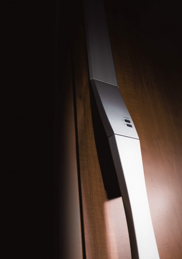 使いやすさとデザインを高めた電気錠一体型ハンドル。ボタン操作部とシリンダー、ハンドルを一体化し、前面は操作ボタンとLEDランプのみ。指1本で簡単に操作でき、リモコンキーをバッグやポケットに入れて身につけていれば本体のタッチ操作で施解錠できる。