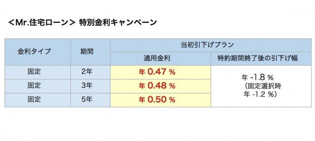 ひとつは、同社が取り扱う住宅ローン「Mr.住宅ローン」の特別金利キャンペーン。期間中に以下の金利タイプを借り入れた個人に特別金利を適用する。