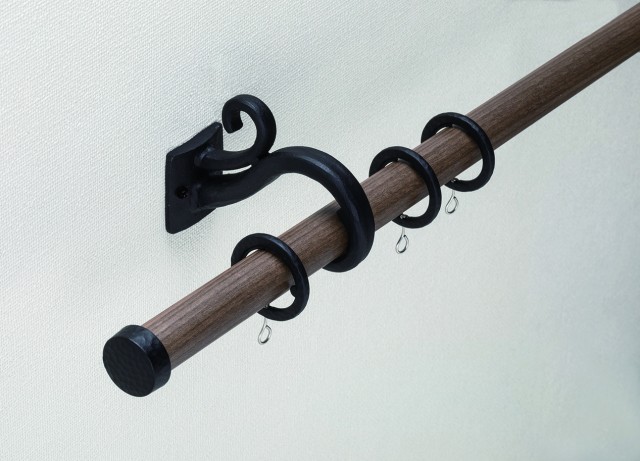 装飾性カーテンレールの「ルブラン22」は、人気のナチュラルモダンと長年使い込んだようなアンティークの風合いを融合したデザイン。ポール径は22ミリで、ブラケットは植物のツルのモチーフを採用。ブラケット、キャップ、リングランナーには、鍛造風の凹凸をほどこし手づくり感を演出した。