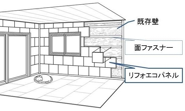 「リフォエコパネル」は、アクリアと化粧クロスを組み合わせた455角のパネル状で、戸建て住宅やマンション、オフィス、学校などの既存壁に室内側から専用面ファスナーで張るだけ。6畳間の壁2面に張る場合、工期は約1日、工費込みで約40万円で断熱リフォームが完了する。