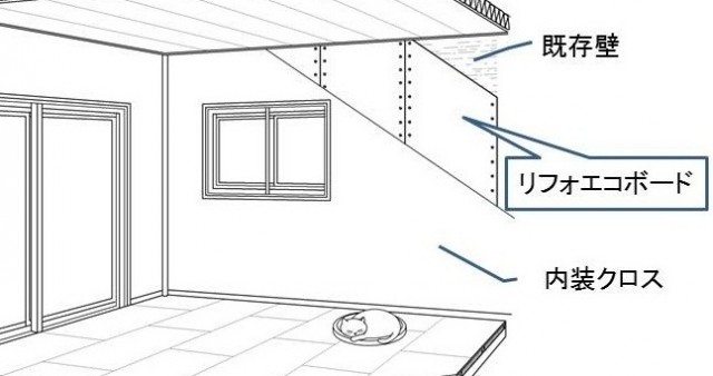アクリアに圧縮プレスをかけた高密度ボード状の「リフォエコボード」は、12x910x1820ミリと石こうボードと同サイズ。既存の室内壁のうえにビスまたは接着剤で取り付け、パテ処理をしてクロスで仕上げる。厚みを12ミリにしたことでサッシまわりの額縁などの付帯工事が不要となり、コスト低減と工期短縮が図れるとする。6畳間の壁2面の工費込み設計価格は約15万円。