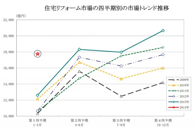 矢野経済研究所(東京都中野区)は6月6日、2014年第1四半期(1〜3月)における住宅リフォーム市場調査の結果を発表した。