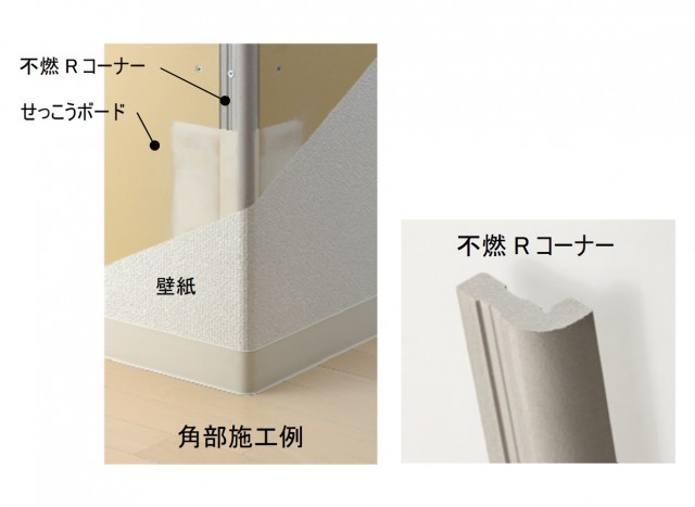 材質は繊維混入セメント・けい酸カルシウム板 。大きな丸み(15R)があるため子どもや高齢者がいる住宅の壁に適し、クロス、じゅらく、漆喰、珪藻土、塗装仕上げが可能。省令準耐火構造に対応する。