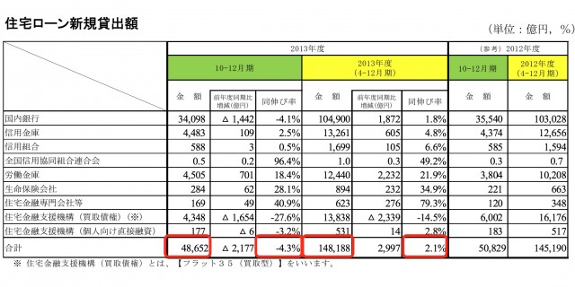 それによると、2013年度10-12月期の住宅ローン新規貸出額は4兆8652億円で、対前年度比4.3%減少。2013年度(4-12月期)の住宅ローンの新規貸出額は14兆8188億円、対前年度比で2.1%の増加となった。詳細はコチラからダウンロードできる。
