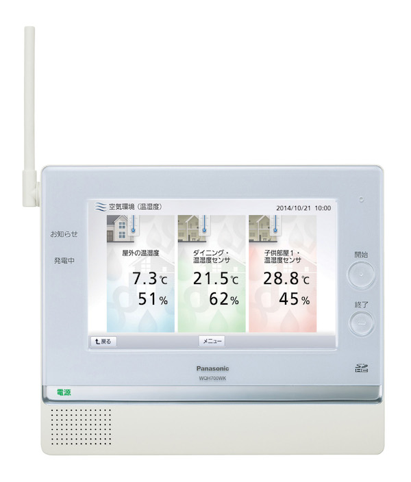 リビング、寝室、洗面、廊下や住宅の外回りで温度・湿度を計測し、その情報をHEMS画面やスマートフォン、タブレット、テレビなどで確認できるもの。最大10台まで接続でき、1画面で3カ所の情報を見える化する。